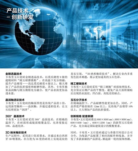 Cabri擁有多名國際知名產(chǎn)品設(shè)計師,瓷磚花色和產(chǎn)品設(shè)計始終保持國際水準,輕松營造讓人著迷和向往的裝飾空間。卡布里?玉石瓷磚甄選世界珍稀玉石為母版,采用先進科技,打造出精彩絕倫的新型玉石瓷磚產(chǎn)品,囊括600*600(mm)、800*800(mm)、900*900(mm)、600*1200(mm)等創(chuàng)新規(guī)格,掀起新一輪的“玉石瓷磚”裝飾熱潮。